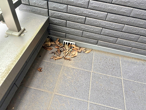秋は落ち葉が非常に多く、排水不良が起きやすい季節です。特に強風や台風の後は、葉っぱや枝、砂が一気に溜まりやすく、排水口が塞がる原因になります。定期的にチェックし、早めに落ち葉を取り除くことが大切です。