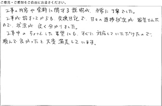 工事の内容や塗装に関する説明が、非常に丁寧でした。 工事が始まってからも、交換日記で日々の進捗状況が報告されたので、状況が良く分かりました。 工事中のちょっとした要望にも、すぐに対応していただけたので、頼んで良かったと大変満足しています。